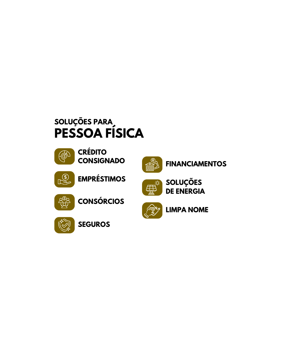 Crédito consignado | Empréstimos | Consórcio | Seguros | Financimentos | Soluções em energia | Limpa nome