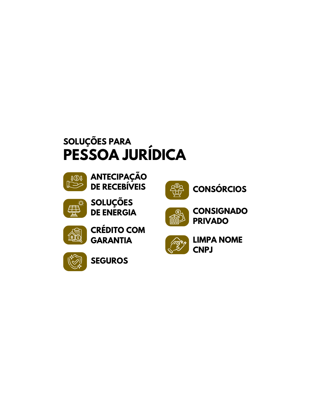 Antecipação de Recebíveis | Soluções de energia solar | Crédito com garantia | Seguros | Consórcios | Consignado privado | Limpa nome CNPJ